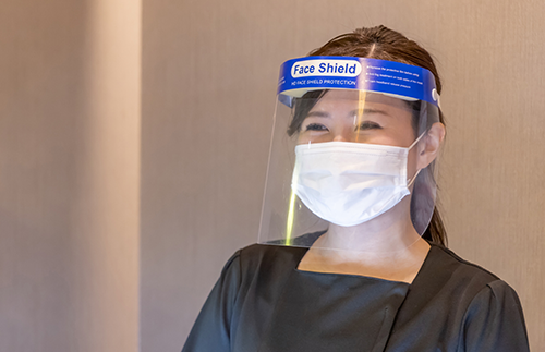 お客さまご対応時には施術時を含めエステティシャンならびにスタッフは、マスク・フェイスガードの着用を徹底しております。